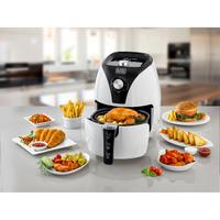 This air fryer features a sleek black and white design, blending seamlessly into any kitchen décor. It offers adjustable temperature control, making it easy to cook a variety of dishes. The non-stick basket ensures easy cleaning after every use.