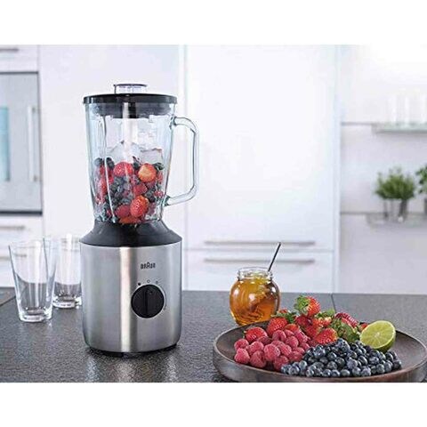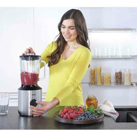 The Braun Glass Blender BLSJB3273SI features a powerful 800W motor for smooth blending.